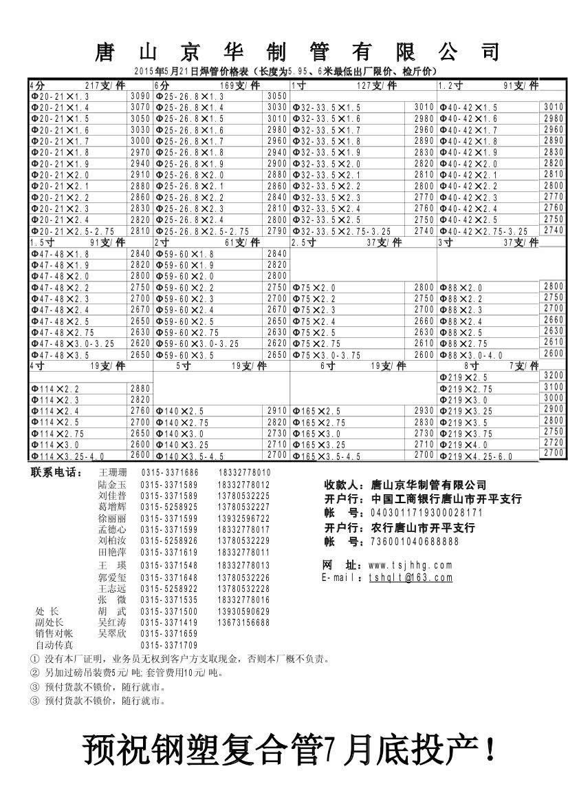 唐山京华2015年5月21日焊管价格表(长度为5.95、6米最低出厂限价、检斤价)