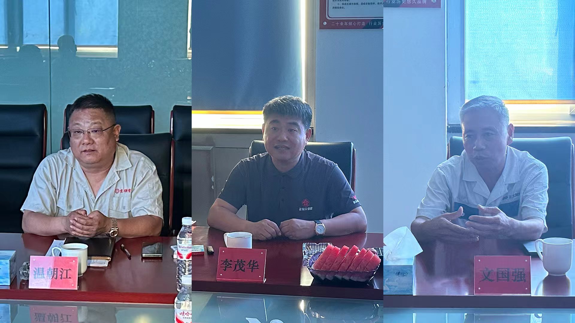 2025年8月6日,唐山正元管业有限公司总经理李茂华、迁安正大通用钢管有限公司总经理文国强分别携销售主管人员应邀莅临唐山京华。公司总经理温朝江、供销副总胡武和销售主管人员接待并陪同,三方就当前焊接钢管行业面临的市场态势、客户需求及发展困境展开深入探讨,并达成共识。